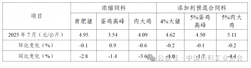 表3 2025年7月饲料企业浓缩饲料和添加剂预混合饲料平均价格